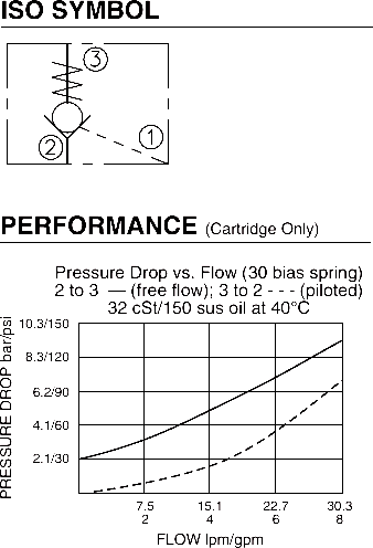 The HPC08-30 allows flow from 2 to 3, while normally blocking flow from 3 to 2. Flow will be allowed from 3 to 2 when pressure at 1 exceeds one-third the pressure at 3.