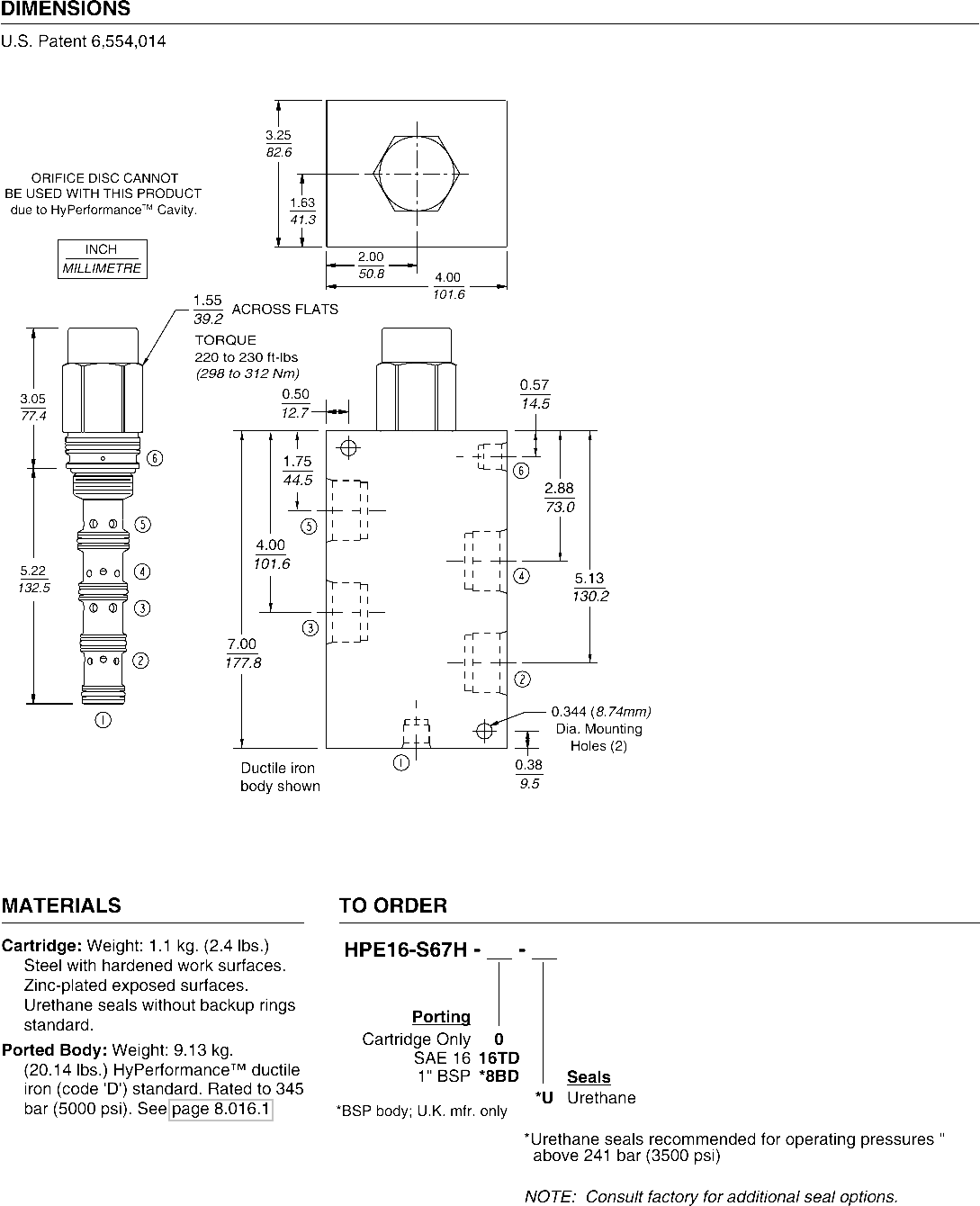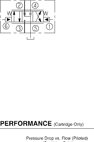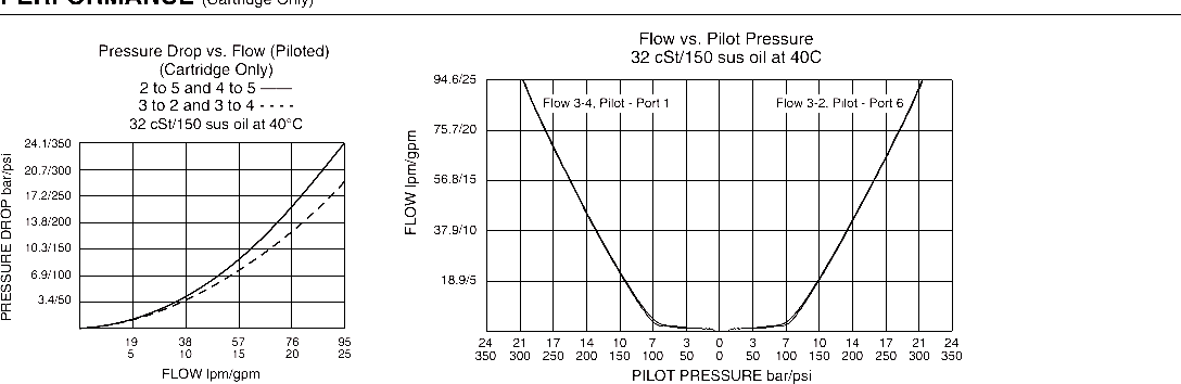 Maximum Operating Pressure: Ports 2, 3, 4 (work): 350 bar (5075 psi) (10% life cycle) 420 bar (6090 psi); Ports 1 and 6 (pilot): 35 bar (500 psi); Port 5 (tank): 69 bar (1000 psi)