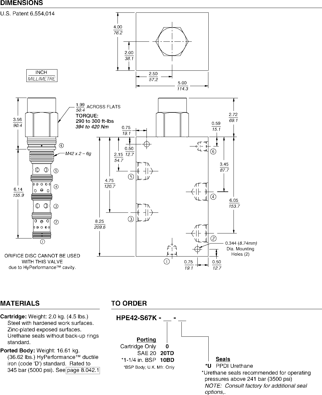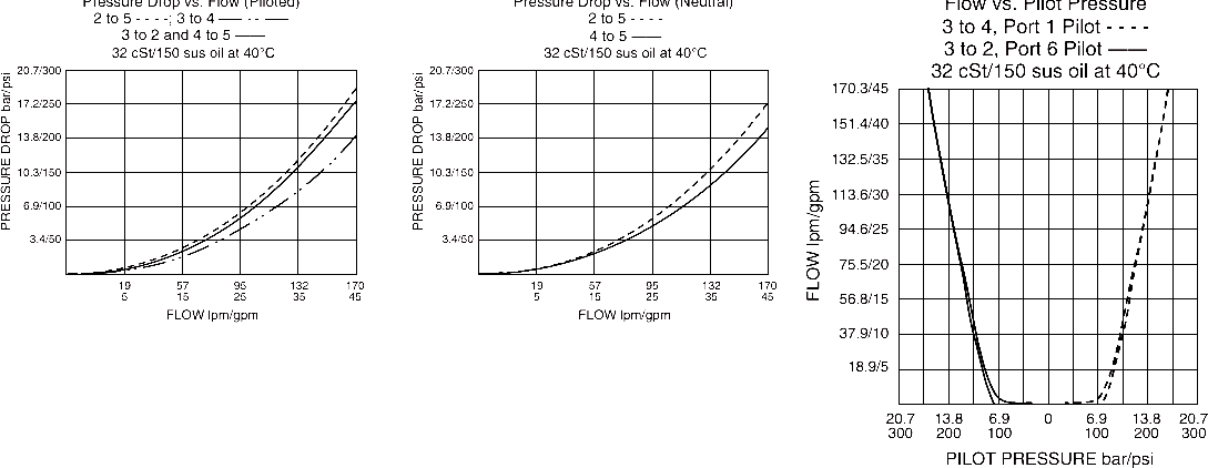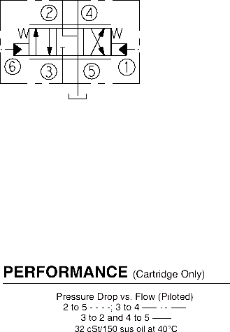 Maximum Operating Pressure: Ports 2, 3, 4 (work): 350 bar (5075 psi) (10% life cycle) 420 bar (6090 psi); Ports 1 and 6 (pilot): 35 bar (500 psi); Port 5 (tank): 69 bar (1000 psi)