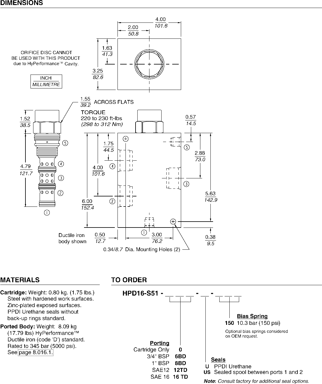 Flow: Up to 151 lpm (40 gpm) with PPDI urethane seals and no flow restriction; up to 151 lpm (40 gpm) with seales spool between ports 1 and 2 and restricted flow between ports 2 and 3 and 3 and 4 up to 95 lpm (25 gpm) maximum.