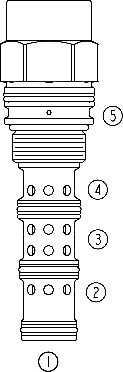 When in neutral the HPD16-S51 allows flow between ports 2, 3 and 4. On remote pilot signal at 1, the valve’s spool shifts to block all ports. The spring chamber is vented to the tank through port 5. The vented spring chamber allows the valve to be fully pressurized at ports 1, 2, 3, and 4 without affecting required pilot pressure. Pressure at port 5 will increase the required pilot pressure at a 1:1 ratio.
