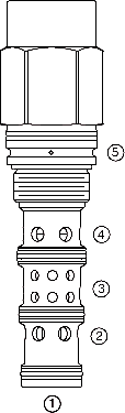 When in neutral the HPD42-S51 allows flow between ports 2, 3 and 4. On remote pilot signal at 1, the valve’s spool shifts to block all ports. The spring chamber is vented to the tank through port 5. The vented spring chamber allows the valve to be fully pressurized at ports 1, 2, 3, and 4 without affecting required pilot pressure. Pressure at port 5 will increase the required pilot pressure at a 1:1 ratio.