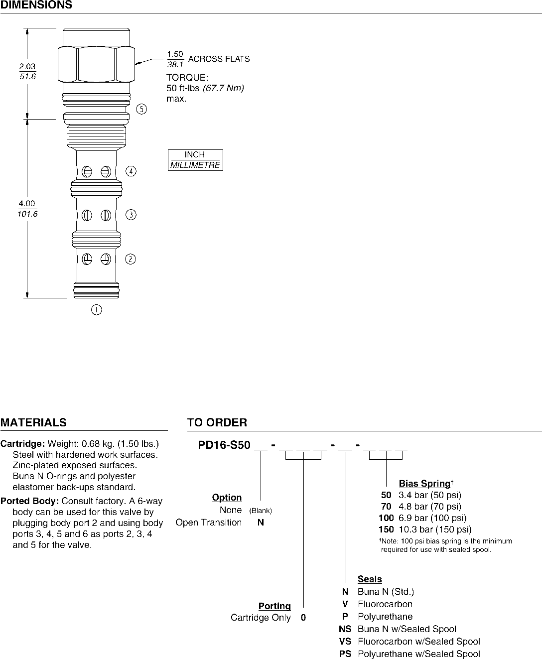 When in neutral the PD16-S50 allows flow between ports 3 and 2 while blocking at 4. On remote pilot signal at 1, the valve’s spool shifts to allow flow between 3 and 4, while blocking at 5. The spring chamber is vented to the tank through port 5. The vented spring chamber allows the valve to be fully pressurized at ports 1, 2, 3, and 4 without affecting required pilot pressure. Pressure at port 5 will affect required pilot pressure.