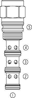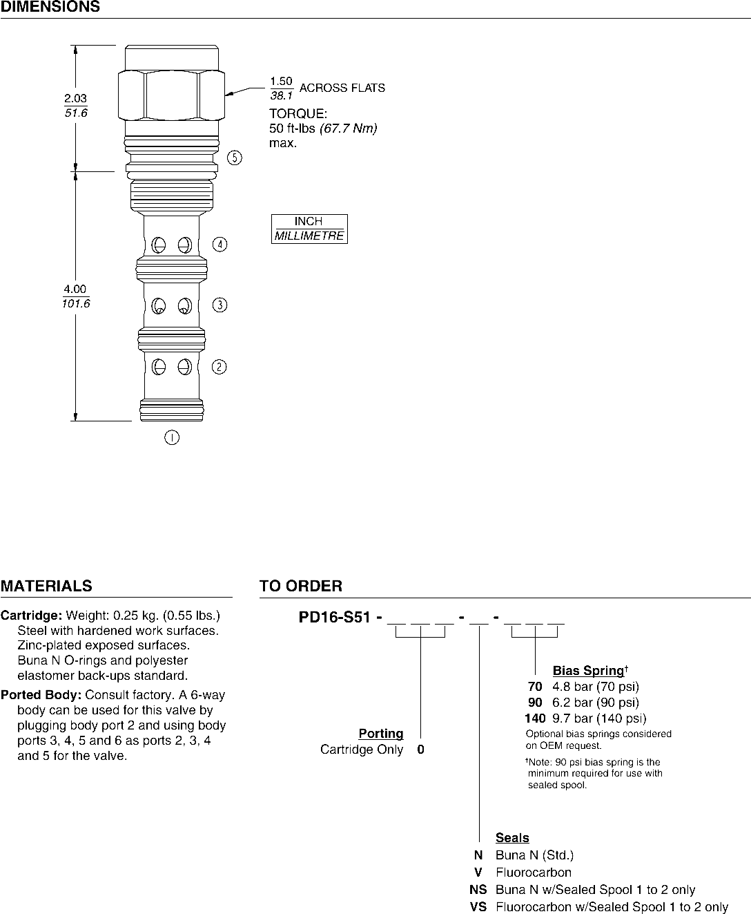 When in neutral the PD16-S51 allows flow between ports 2, 3 and 4. On remote pilot signal at 1, the valve’s spool shifts to block all ports. The spring chamber is vented to the tank through port 5. The vented spring chamber allows the valve to be fully pres-surized at ports 1, 2, 3, and 4 without affecting required pilot pressure. Pressure at port 5 will affect required pilot pressure.