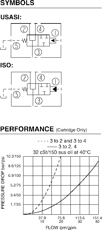 Internal Leakage at 207 bar (3000 psi): 410 ml/minute (25 cu. in./minute) between ports 3 and 2. 820 ml/minute (50 cu. in./minute) between ports 3 and 4.