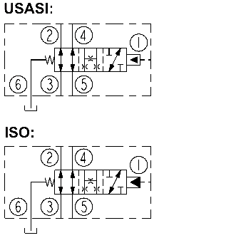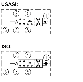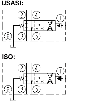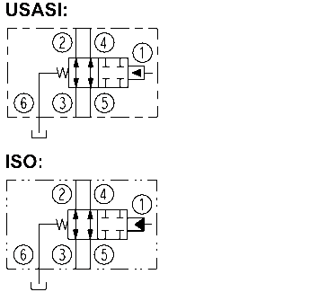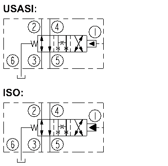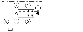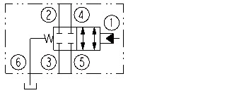 In the neutral position, the HPD42-S63 blocks flow at all ports. On remote pilot signal at 1, the valve shifts to allow flow between ports 2 and 3, and between 4 and 5 bidirectionally. The spring chamber is vented to the tank through port 6. The vented spring chamber allows the valve to be fully pressurized at ports 1, 2, 3, 4 and 5 without affecting required pilot pressure. Pressure at 6 will increase the required pilot pressure at a 1:1 ratio.