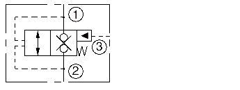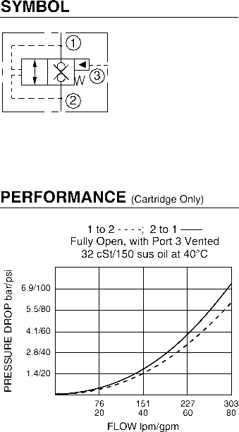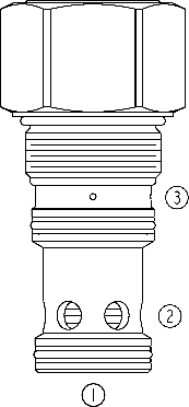 The HEP42-S38 is a spring-biased poppet valve which will block 1 to 2 or 2 to 1 until pressure at 1 or 2 exceeds the cumulative pressure at 3 and bias spring. With no pressure at 3, flow will be allowed from 1 to 2 or 2 to 1 once the bias spring force is overcome with pressure at 1 or 2. When the element is in the closed state, the ratio of areas 1 and 2 is 1:1, and the ratio of areas 1 or 2 to 3 is 1:2.