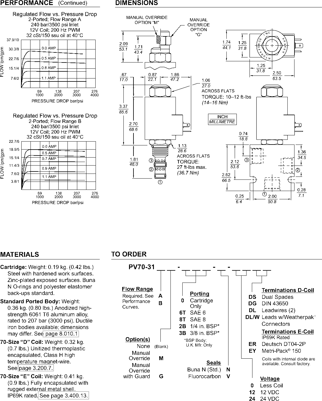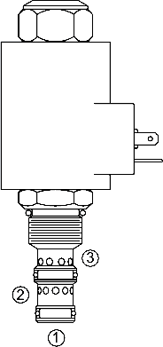 The PV70-31 will regulate flow out of port ➂ regardless of system working pressure. With increasing current applied to the solenoid, the PV70-31 will decrease output flow.
