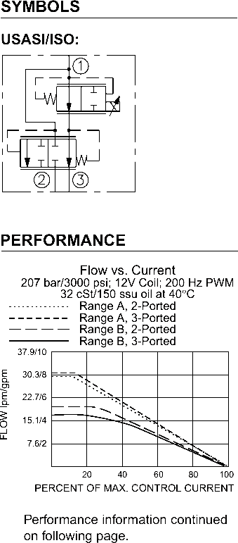 A solenoid operated, electrically-variable, three-port, pressure-compensated, spool-type, normally open when de-energized, proportional flow control valve. It can be used as a priority-type flow regulator with pressure-compensated, regulated and bypass flow. It can also be used as a restrictive-type two-way, pressure-compensated flow regulator when the bypass line (port ➁) is blocked.