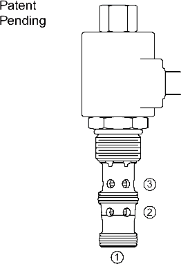 The TS12-36 allows flow from ➁ to ➀ until pressure at ➀ equals the setting determined by the coil current. Port ➂ is typically connected to the reservoir. If external load increases the pressure at ➀ beyond this setting, pressure is relieved by allowing flow from ➀ to ➂. Minimum pressure at ➀ without any current is 100 psi.If external circuitry allows the pressure at ➁ to fall below the pressure at ➀, the valve will allow free flow from ➀ to ➁ regardless of the setting of the valve or the amount of current in the coil.