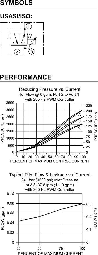 Maximum Pilot Flow and Leakage: 0.49 lpm (0.13 gpm) with max. control current and with inlet pressure at 276 bar (4000 psi) at regulated flow of 3.8 lpm (1 gpm).