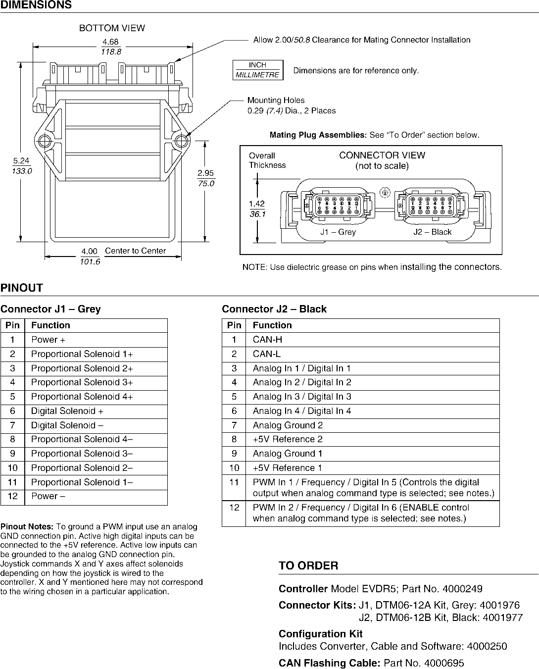 PWM input signals can be from a joystick, a PLC or Engine Control Module. Analog inputs and multiple switched inputs are optional to suit a range of applications. The CAN J1939 communications port, along with the USB-to-CAN adapter, allow the EVDR5 setup parameters to be configured using a PC. Also, the CAN port can be set up to provide communications and control with other devices on the network.This versatile, multi-function controller is suitable for a wide range of heavy duty industrial, marine, and mobile off-highway equipment applications, such as transmission controls, vehicle traction controls, and drive-by-wire control systems.