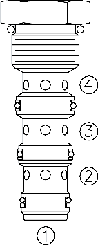 The cartridge will combine input flows from ports ➁ and ➃The FD10-42 is designed to maintain a flow path to both combining ports ➁ and ➃ when one port is “free-wheeling.” This feature keeps hydraulic (parallel) motor drive