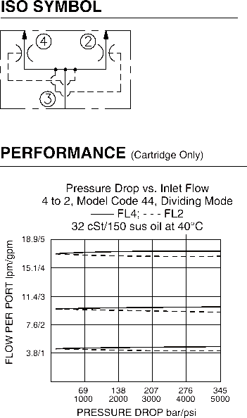 In the dividing mode, the FD50-45 will divert input flow from port 3 to ports 2 and 4, based on the ratio specified, regardless of operating pressure. When the flow direction is reversed the valve will combine flows from 2 and 4 to port 3. Synchronizing flow is provided in both the dividing and combining modes at “bottomed” conditions in cylinder applications and at “stalled” conditions in motor applications.