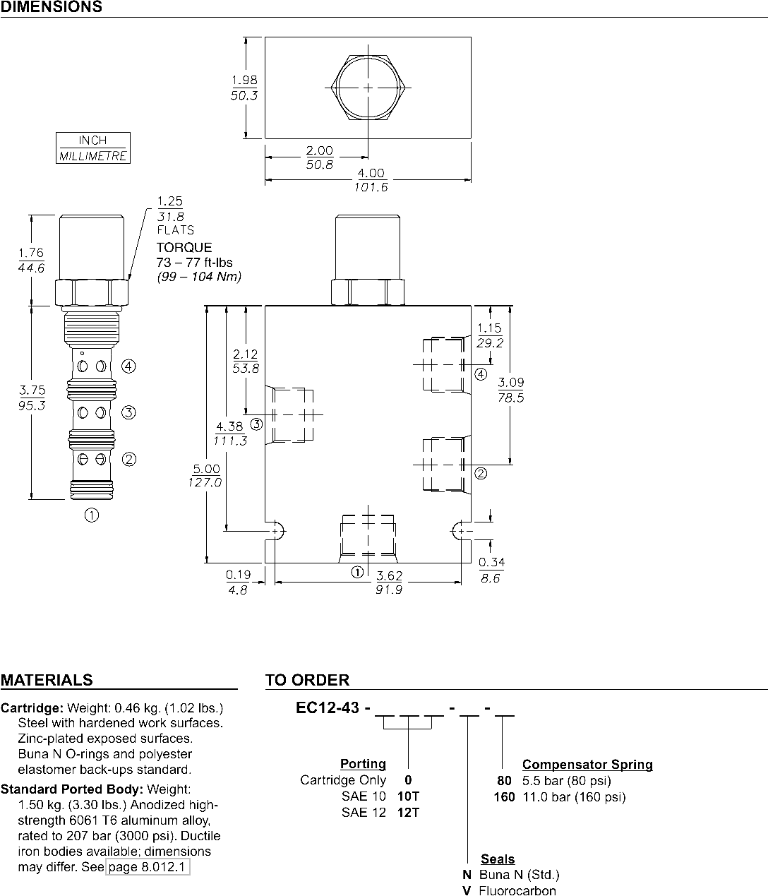 With inlet flow at port ➂, the EC12-43 will deliver required priority flow at port ➃, based on the size of the external orifice, regardless of load pressure. Excess flow