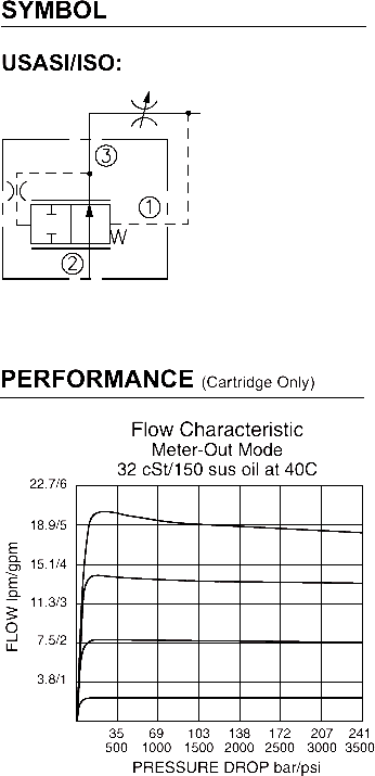 Flow Rate: 11.4 lpm (3.0 gpm) with 5.5 bar (80 psi) compensating spring;18.9 lpm (5.0 gpm) with 10.3 bar (150 psi) compensating spring30.3 lpm (8.0 gpm) with 17.2 bar (250 psi) compensating spring