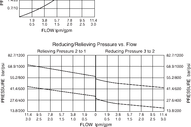 3212.8/402.1/304.8/703.4/504.1/601.4/200.7/107.82.05.71.59.52.53.81.01.90.511.43.0FLOW lpm/gpmPRESSURE bar/psiPressure Drop vs. Flow; 3 to 232 cSt/150 sus oil at 40°CReducing/Relieving Pressure vs. FlowPRESSURE bar/psiPRESSURE bar/psi41.4/60013.8/20027.6/40055.2/80068.9/100082.7/120041.4/60013.8/20027.6/40055.2/80068.9/100082.7/1200FLOW lpm/gpm9.52.511.43.07.82.05.71.53.81.01.90.51.90.53.81.05.71.57.82.09.52.511.43.0Reducing Pressure 3 to 2Relieving Pressure 2 to 1