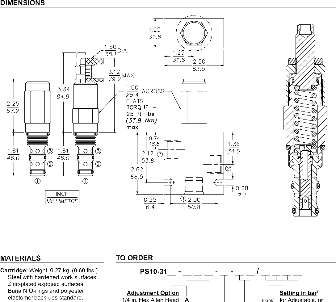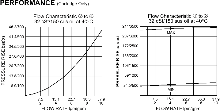 In its steady state, the PS10-31 blocks flow at ➀, while allowing flow to pass from ➁ to ➂On attainment of a pre-determined pressure at ➀, the cartridge shifts to open ➀ to ➁