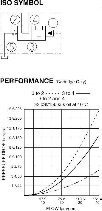 Internal Leakage: 350 bar (5075 psi) at 32 cSt. Ports 3 to 4: 492 ml/min (30 cu.in./min); Ports 3 to 2: 655 ml/min (40 cu.in./min); Pilot Pressure: 350 bar (5075 psi).